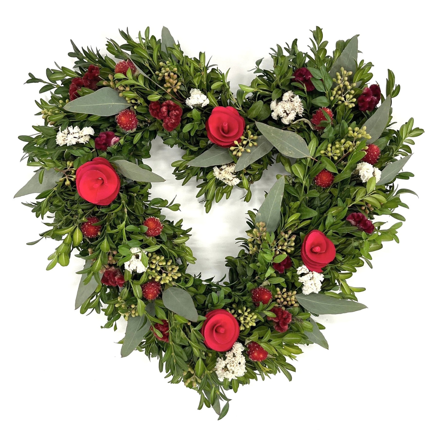 No better way to ask someone to be your Valentine this year! Crafted with boxwood and eucalyptus and complimented with celosia, globes, wooden red roses and a touch of white statice. This lovely wreath can be enjoyed indoors or in an outdoor protected area for months to come.