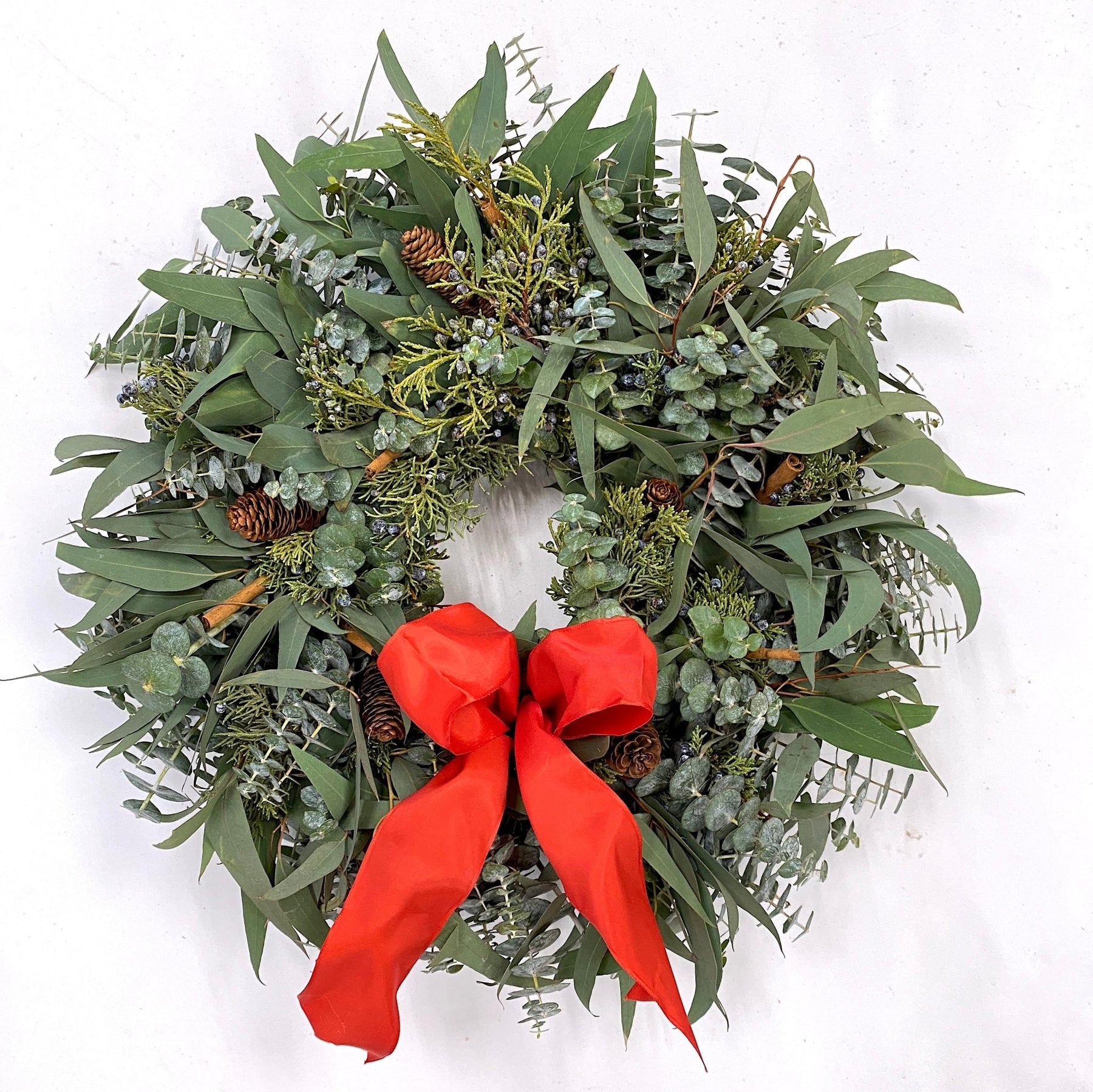 Bring the cheer of Christmas and the holidays with our festive Cinnamon Pine Cone Wreath. Aromatic fresh eucalyptus and juniper is hand harvested and woven into a beautiful wreath and then adorned with pine cones, cinnamon sticks, and a festive red bow on our family farm in California.