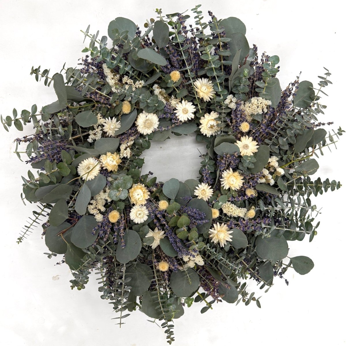 New fragrant dried lavender and fresh eucalyptus make a wonderful combination of textures and scents. An abundance of creamy white strawflowers, statice, and globe amaranth make this a classic piece to be enjoyed for months. Display this lush wreath indoors or on your protected front door. Makes a wonderful gift too for any occasion.
